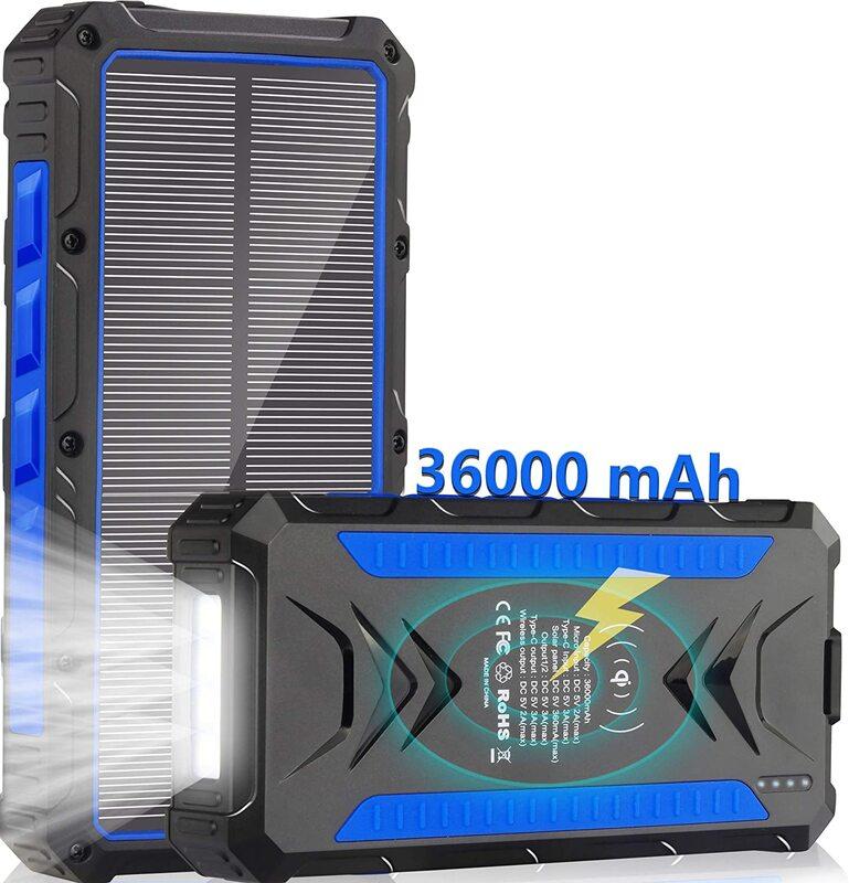36000 mAh Solar Power Bank with 4 USB/Type C Outputs and LED Lamp, Portable Outdoor Waterproof Qi Wireless Power Bank Solar Panel Compatible for iPhone Samsung Smartphones [36000mAh Ultra High Capacity]: Built-in 36000mAh rechargeable Li-polymer battery, the solar power bank can charge your devices (like cellphone, camera, MP3, MP4, PSP) under the stable power supply. It can automatically adjust the output to deliver the most suitable current, keep your devices from overcharging, over-current, over-voltage and short circuit.Its enough to charge an iPhone XS for 7 times, Samsung Galaxy S10 up to 5-6 times, an iPad Pro for 2 times, Huawei P30 up to 5 times [QI Wireless Charging and Multiple Output Ports]: Equipped with QI wireless charging technology, the solar charger is well compatible with all QI enabled devices. Built-in Dual USB outputs and 1 Type-C output, the solar power bank is able to charge 4 electronic devices (USB/Type-C/QI wireless) simultaneously, so you can choose the convenient way to charge your device. ( Note: Only QI enabled devices can use for wireless charging technology) [Dual Input Ports & Solar Charging 2-in-1]: With dual input ports (high speed Type-C and Micro USB), the solar power bank can be fully charged by 9-12 hours. The solar panel could absorb sun light and convert it into electricity. (Kindly Note: Solar charging is for emergency use, do not take solar power as a primary charging source. Charging the Power bank on Solar only will take around 1 week. It is highly recommend you fully charge via wall charger on first use) [Perfect for Outdoor Enthusiasts]: IP66 rain-proof, dust-proof, shock-proof and splash-proof. Built-in LED flashlight with 3 modes (lighting/ flashing/ SOS), which can be used as camping lamp, emergency lamp and rescue signal lamp. Equipped with solar panel, just hang it on your backpack to recharge via sunlight. It's perfect for outdoor activities, like camping, hiking and other emergencies. [What You Will Get]: 36000mAh portable solar charger, 1X Micro USB cable, 1X Lanyard, 1X Carabiner, 1X User manual.